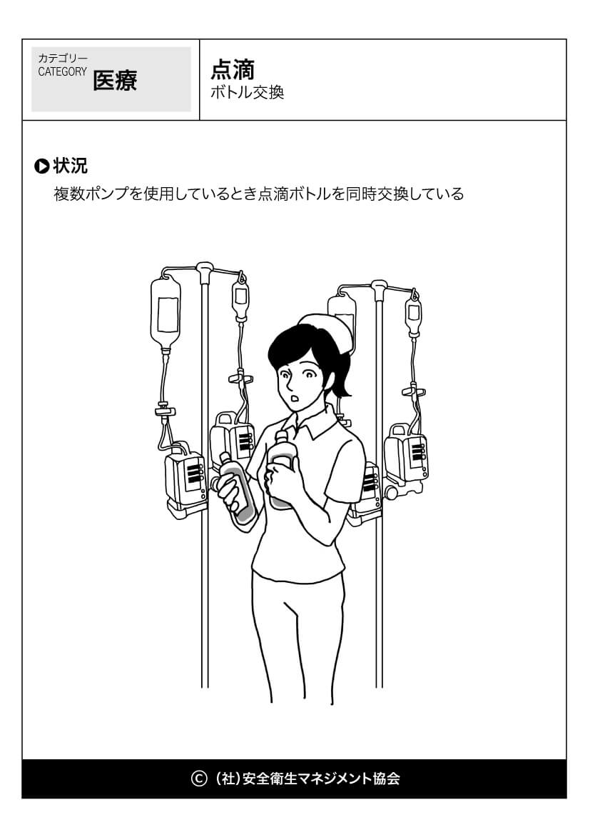 ホーム > 危険予知訓練(KYT)無料イラストシート集 > 医療・看護 危険予知活動 以下(一財)中小建設業特別教育協会へのリンク 危険予知訓練(KYT) 危険予知活動(KY)動画集 カテゴリー 林業 (1) 製造業 (56) 医療・看護 (60) 事務・一般 (59) 飲食 (23) 実験 (21) その他 (8) 運輸業 (16) 農業 (25) 水産・漁業 (18) 点滴-ボトル交換 ボトル交換 //php if ( the_field('jyokyo') ) : ?> PDFダウンロード 状況 複数ポンプを使用しているとき点滴ボトルを同時交換している カテゴリー: 医療・看護 このページをシェアする Twitter Facebook LINE 講習会をお探しですか? 講習会一覧はこちら スケジュールページからお申込み
