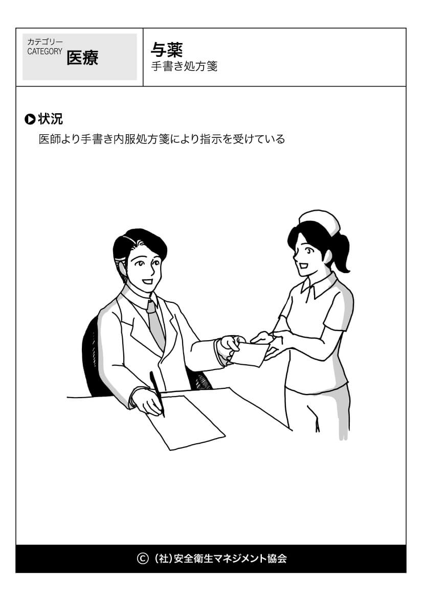 ホーム > 危険予知訓練(KYT)無料イラストシート集 > 医療・看護 危険予知活動 以下(一財)中小建設業特別教育協会へのリンク 危険予知訓練(KYT) 危険予知活動(KY)動画集 カテゴリー 林業 (1) 製造業 (56) 医療・看護 (60) 事務・一般 (59) 飲食 (23) 実験 (21) その他 (8) 運輸業 (16) 農業 (25) 水産・漁業 (18) 与薬 -手書き処方箋 手書き処方箋 //php if ( the_field('jyokyo') ) : ?> PDFダウンロード 状況 医師より手書き内服処方箋により指示を受けている カテゴリー: 医療・看護 このページをシェアする Twitter Facebook LINE 講習会をお探しですか? 講習会一覧はこちら スケジュールページからお申込み