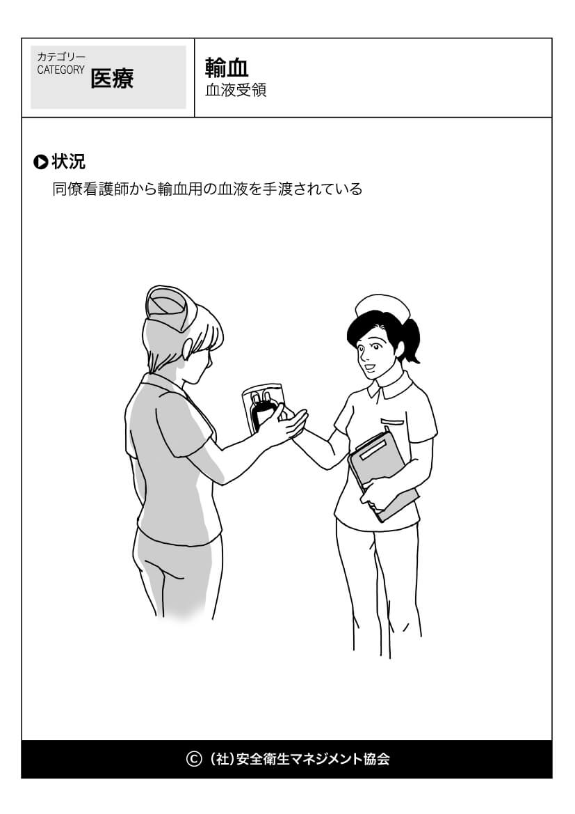 ホーム > 危険予知訓練(KYT)無料イラストシート集 > 医療・看護 危険予知活動 以下(一財)中小建設業特別教育協会へのリンク 危険予知訓練(KYT) 危険予知活動(KY)動画集 カテゴリー 林業 (1) 製造業 (56) 医療・看護 (60) 事務・一般 (59) 飲食 (23) 実験 (21) その他 (8) 運輸業 (16) 農業 (25) 水産・漁業 (18) 輸血-血液受領 輸血 血液受領 //php if ( the_field('jyokyo') ) : ?> PDFダウンロード 状況 同僚看護師から輸血用の血液を手渡されている カテゴリー: 医療・看護 このページをシェアする Twitter Facebook LINE 講習会をお探しですか? 講習会一覧はこちら スケジュールページからお申込み
