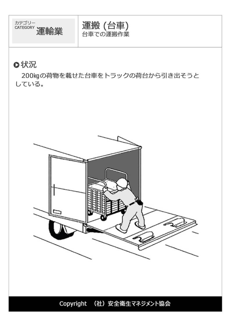 ホーム > 危険予知訓練(KYT)無料イラストシート集 > 運輸業 危険予知活動 以下(一財)中小建設業特別教育協会へのリンク 危険予知訓練(KYT) 危険予知活動(KY)動画集 カテゴリー 林業 (1) 製造業 (56) 医療・看護 (60) 事務・一般 (59) 飲食 (23) 実験 (21) その他 (8) 運輸業 (16) 農業 (25) 水産・漁業 (18) 運搬(台車) 台車での運搬作業 //php if ( the_field('jyokyo') ) : ?> PDFダウンロード 状況 200kgの荷物を載せた台車をトラックの荷台から引き出そうとしている。 カテゴリー: 運輸業 このページをシェアする Twitter Facebook LINE 講習会をお探しですか? 講習会一覧はこちら スケジュールページからお申込み