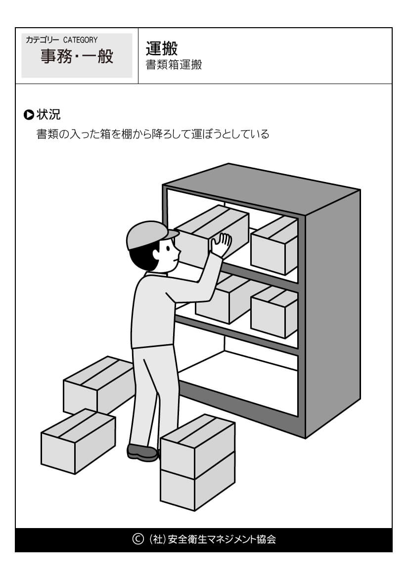 ホーム > 危険予知訓練(KYT)無料イラストシート集 > 事務・一般 危険予知活動 以下(一財)中小建設業特別教育協会へのリンク 危険予知訓練(KYT) 危険予知活動(KY)動画集 カテゴリー 林業 (1) 製造業 (56) 医療・看護 (60) 事務・一般 (59) 飲食 (23) 実験 (21) その他 (8) 運輸業 (16) 農業 (25) 水産・漁業 (18) 運搬 -書類箱運搬 書類箱運搬 //php if ( the_field('jyokyo') ) : ?> PDFダウンロード 状況 書類の入った箱を棚から降ろして運ぼうとしている カテゴリー: 事務・一般 このページをシェアする Twitter Facebook LINE 講習会をお探しですか? 講習会一覧はこちら スケジュールページからお申込み