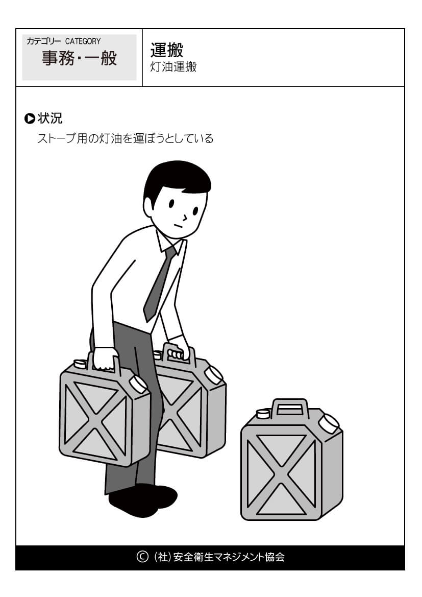 ホーム > 危険予知訓練(KYT)無料イラストシート集 > 事務・一般 危険予知活動 以下(一財)中小建設業特別教育協会へのリンク 危険予知訓練(KYT) 危険予知活動(KY)動画集 カテゴリー 林業 (1) 製造業 (56) 医療・看護 (60) 事務・一般 (59) 飲食 (23) 実験 (21) その他 (8) 運輸業 (16) 農業 (25) 水産・漁業 (18) 運搬 -灯油運搬 灯油運搬 //php if ( the_field('jyokyo') ) : ?> PDFダウンロード 状況 ストーブ用の灯油を運ぼうとしている カテゴリー: 事務・一般 このページをシェアする Twitter Facebook LINE 講習会をお探しですか? 講習会一覧はこちら スケジュールページからお申込み