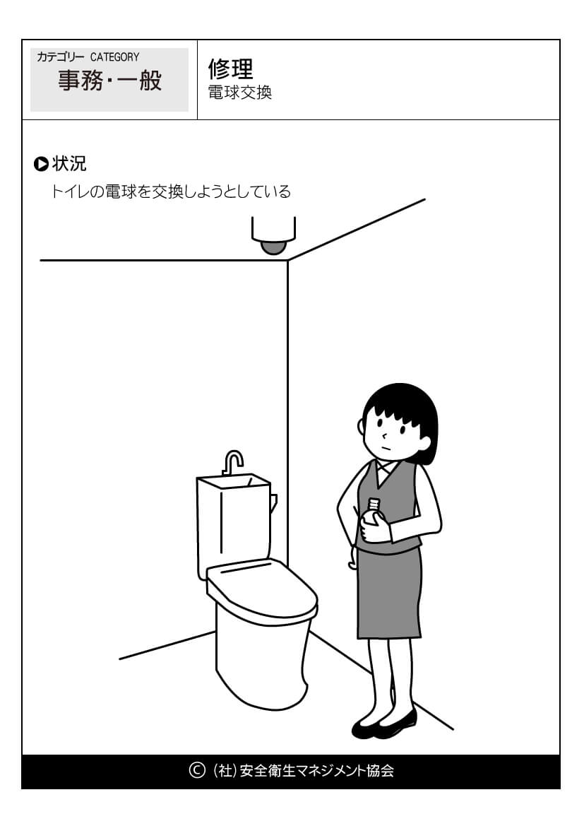 ホーム > 危険予知訓練(KYT)無料イラストシート集 > 事務・一般 危険予知活動 以下(一財)中小建設業特別教育協会へのリンク 危険予知訓練(KYT) 危険予知活動(KY)動画集 カテゴリー 林業 (1) 製造業 (56) 医療・看護 (60) 事務・一般 (59) 飲食 (23) 実験 (21) その他 (8) 運輸業 (16) 農業 (25) 水産・漁業 (18) 修理 -電球交換 電球交換 //php if ( the_field('jyokyo') ) : ?> PDFダウンロード 状況 トイレの電球を交換しようとしている カテゴリー: 事務・一般 このページをシェアする Twitter Facebook LINE 講習会をお探しですか? 講習会一覧はこちら スケジュールページからお申込み
