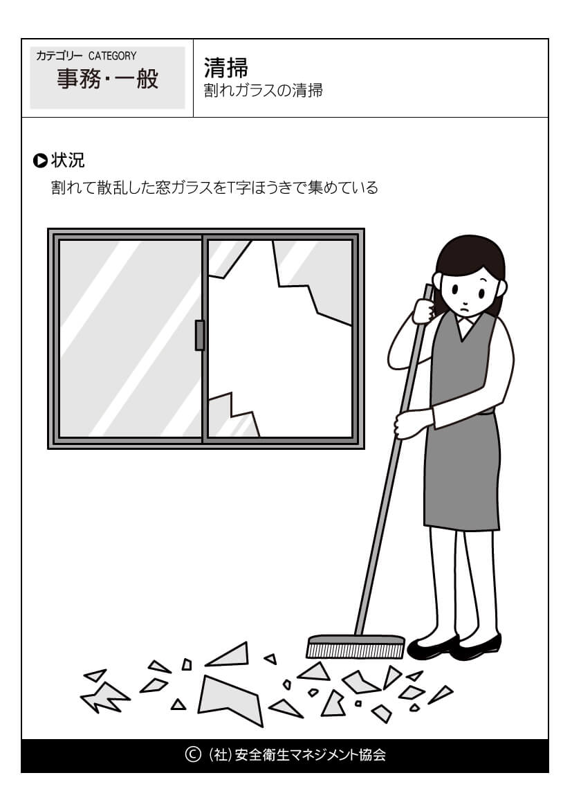 ホーム > 危険予知訓練(KYT)無料イラストシート集 > 事務・一般 危険予知活動 以下(一財)中小建設業特別教育協会へのリンク 危険予知訓練(KYT) 危険予知活動(KY)動画集 カテゴリー 林業 (1) 製造業 (56) 医療・看護 (60) 事務・一般 (59) 飲食 (23) 実験 (21) その他 (8) 運輸業 (16) 農業 (25) 水産・漁業 (18) 清掃 -割れガラスの清掃 割れガラスの清掃 //php if ( the_field('jyokyo') ) : ?> PDFダウンロード 状況 割れて散乱した窓ガラスをT字ほうきで集めている カテゴリー: 事務・一般 このページをシェアする Twitter Facebook LINE 講習会をお探しですか? 講習会一覧はこちら スケジュールページからお申込み