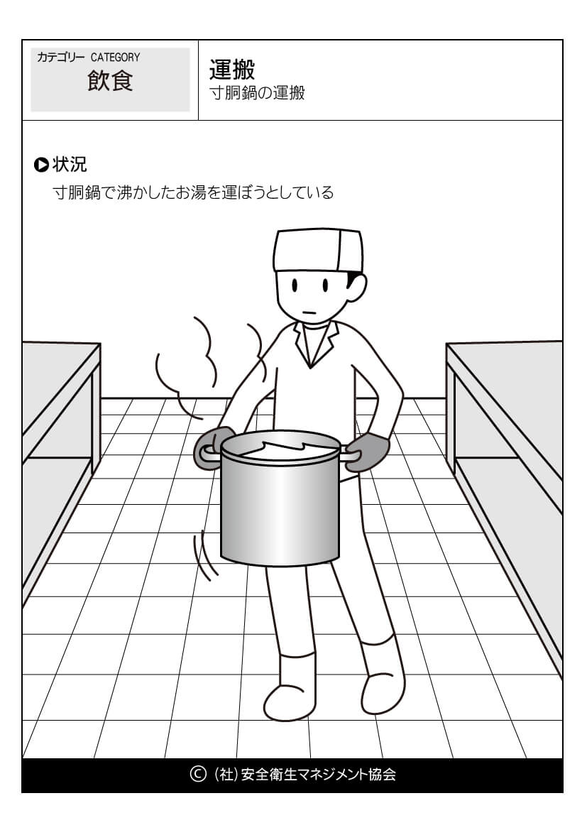 ホーム > 危険予知訓練(KYT)無料イラストシート集 > 飲食 危険予知活動 以下(一財)中小建設業特別教育協会へのリンク 危険予知訓練(KYT) 危険予知活動(KY)動画集 カテゴリー 林業 (1) 製造業 (56) 医療・看護 (60) 事務・一般 (59) 飲食 (23) 実験 (21) その他 (8) 運輸業 (16) 農業 (25) 水産・漁業 (18) 運搬 寸胴鍋の運搬 寸胴鍋の運搬 //php if ( the_field('jyokyo') ) : ?> PDFダウンロード 状況 寸胴鍋で沸かしたお湯を運ぼうとしている カテゴリー: 飲食 このページをシェアする Twitter Facebook LINE 講習会をお探しですか? 講習会一覧はこちら スケジュールページからお申込み