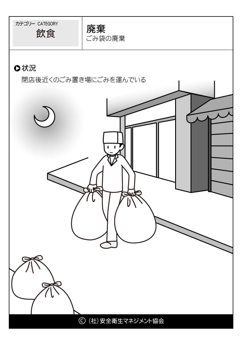 ホーム > 危険予知訓練(KYT)無料イラストシート集 > 飲食 危険予知活動 以下(一財)中小建設業特別教育協会へのリンク 危険予知訓練(KYT) 危険予知活動(KY)動画集 カテゴリー 林業 (1) 製造業 (56) 医療・看護 (60) 事務・一般 (59) 飲食 (23) 実験 (21) その他 (8) 運輸業 (16) 農業 (25) 水産・漁業 (18) 廃棄 ごみ袋の廃棄 ごみ袋の廃棄 //php if ( the_field('jyokyo') ) : ?> PDFダウンロード 状況 閉店後近くのごみ置き場にごみを運んでいる カテゴリー: 飲食 このページをシェアする Twitter Facebook LINE 講習会をお探しですか? 講習会一覧はこちら スケジュールページからお申込み