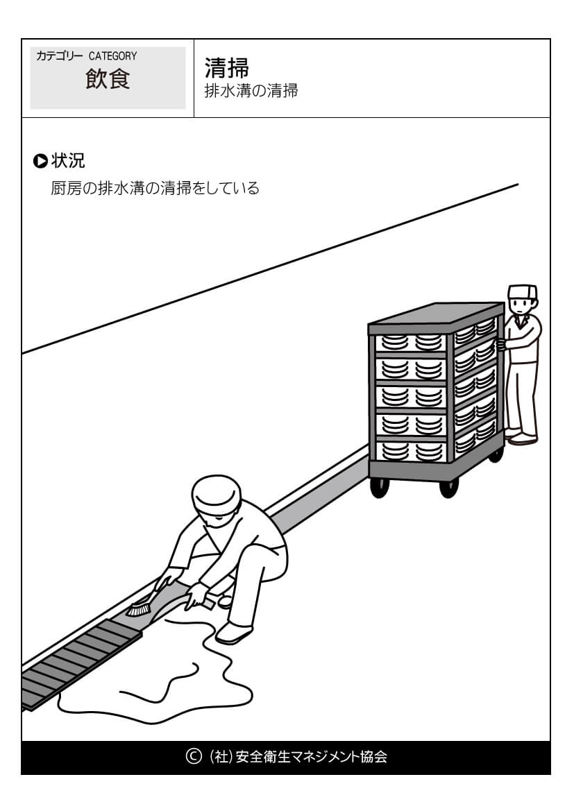 ホーム > 危険予知訓練(KYT)無料イラストシート集 > 飲食 危険予知活動 以下(一財)中小建設業特別教育協会へのリンク 危険予知訓練(KYT) 危険予知活動(KY)動画集 カテゴリー 林業 (1) 製造業 (56) 医療・看護 (60) 事務・一般 (59) 飲食 (23) 実験 (21) その他 (8) 運輸業 (16) 農業 (25) 水産・漁業 (18) 清掃 排水溝の清掃 排水溝の清掃 //php if ( the_field('jyokyo') ) : ?> PDFダウンロード 状況 厨房の排水溝の清掃をしている カテゴリー: 飲食 このページをシェアする Twitter Facebook LINE 講習会をお探しですか? 講習会一覧はこちら スケジュールページからお申込み