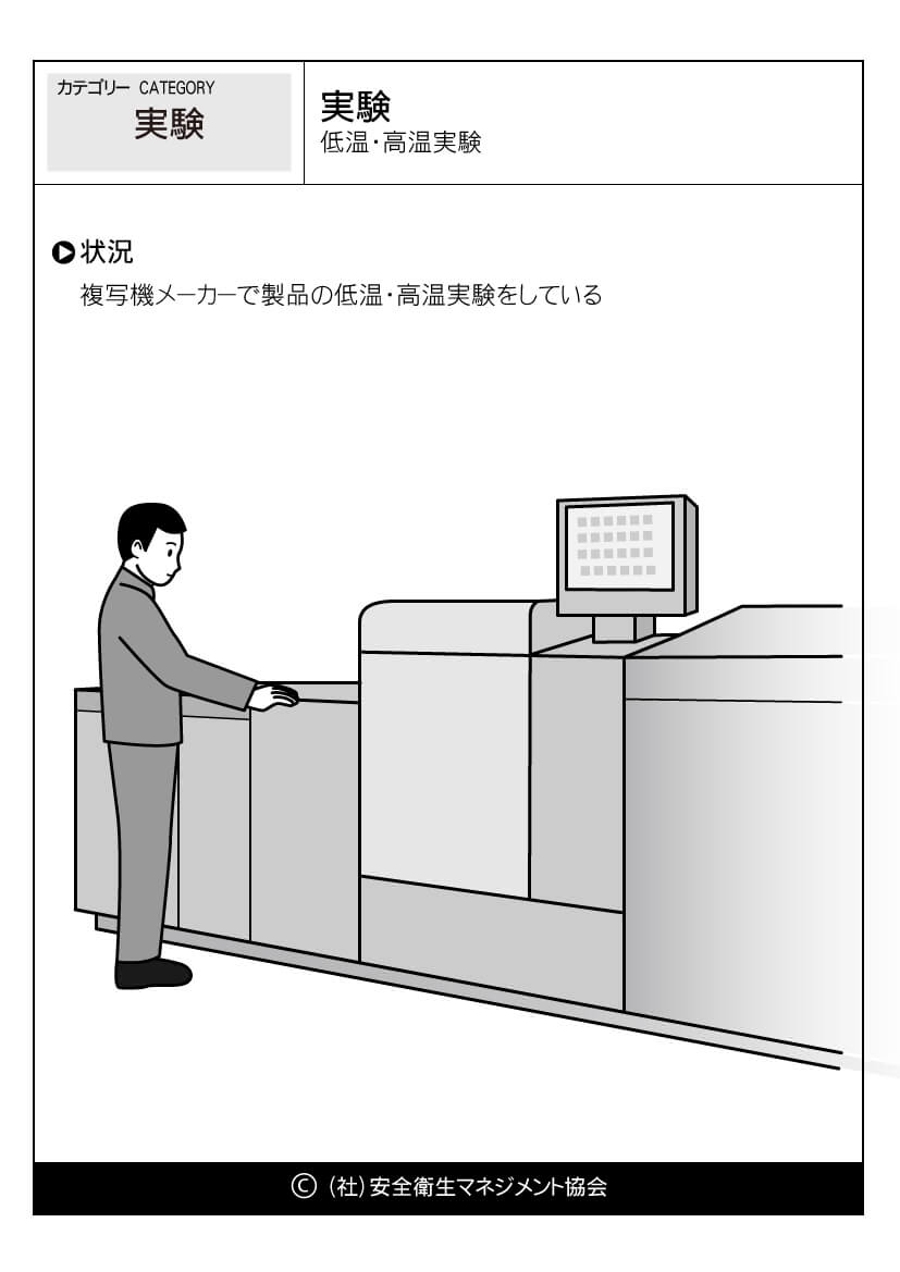ホーム > 危険予知訓練(KYT)無料イラストシート集 > 実験 危険予知活動 以下(一財)中小建設業特別教育協会へのリンク 危険予知訓練(KYT) 危険予知活動(KY)動画集 カテゴリー 林業 (1) 製造業 (56) 医療・看護 (60) 事務・一般 (59) 飲食 (23) 実験 (21) その他 (8) 運輸業 (16) 農業 (25) 水産・漁業 (18) 実験-低温・高温実験 低温・高温実験 //php if ( the_field('jyokyo') ) : ?> PDFダウンロード 状況 複写機メーカーで製品の低温・高温実験をしている カテゴリー: 実験 このページをシェアする Twitter Facebook LINE 講習会をお探しですか? 講習会一覧はこちら スケジュールページからお申込み
