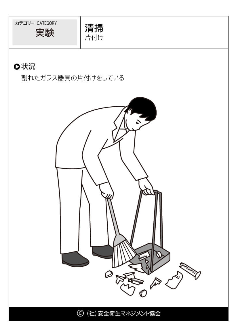 ホーム > 危険予知訓練(KYT)無料イラストシート集 > 実験 危険予知活動 以下(一財)中小建設業特別教育協会へのリンク 危険予知訓練(KYT) 危険予知活動(KY)動画集 カテゴリー 林業 (1) 製造業 (56) 医療・看護 (60) 事務・一般 (59) 飲食 (23) 実験 (21) その他 (8) 運輸業 (16) 農業 (25) 水産・漁業 (18) 清掃-片付け 片付け //php if ( the_field('jyokyo') ) : ?> PDFダウンロード 状況 割れたガラス器具の片付けをしている カテゴリー: 実験 このページをシェアする Twitter Facebook LINE 講習会をお探しですか? 講習会一覧はこちら スケジュールページからお申込み