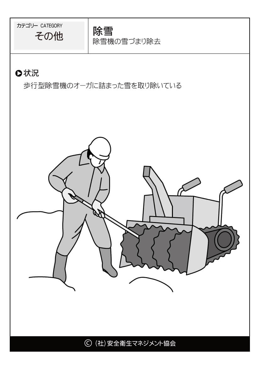 ホーム > 危険予知訓練(KYT)無料イラストシート集 > その他 危険予知活動 以下(一財)中小建設業特別教育協会へのリンク 危険予知訓練(KYT) 危険予知活動(KY)動画集 カテゴリー 林業 (1) 製造業 (56) 医療・看護 (60) 事務・一般 (59) 飲食 (23) 実験 (21) その他 (8) 運輸業 (16) 農業 (25) 水産・漁業 (18) 除雪-除雪機の雪づまり除去(オーガ) 除雪機の雪づまり除去(オーガ) //php if ( the_field('jyokyo') ) : ?> PDFダウンロード 状況 歩行型除雪機のオーガに詰まった雪を取り除いている カテゴリー: その他 このページをシェアする Twitter Facebook LINE 講習会をお探しですか? 講習会一覧はこちら スケジュールページからお申込み