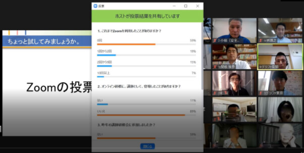 冒頭、機能の確認も合わせオンライン研修等の経験について「投票機能」を使って確認したところ、Zoom経験者は約4割いましたが、オンライン研修の講師経験になると約1割といった状況でした。