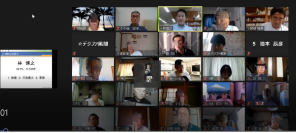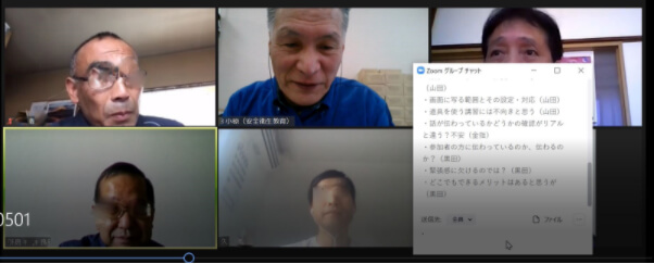 当初は「(参加者の年齢層が高いので)つながらない人が続出するのでは」という懸念がありましたが、通信環境がある程度確保されていれば、初めてでもそう難しいものではないということが体験できました。 今回のようにシステムを熟知した専属スタッフがついて下さり、ある程度事前に打合せをしておけば、講師を担当することも可能ということを大半の参加者が実感されたようです。