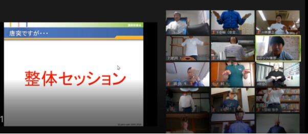 そこで、「整体セッション」も設けられていました。これなども、実際のオンライン講習で不可欠ではないかと思われます。