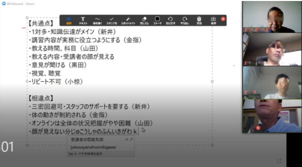 オンライン講習はリアル講習と比較し一長一短はありますが、手書きソフトやチャット機能など使える機能が多く、やり方次第ではリアル講習より充実した内容を提供できるのではないかと思われ、また、昨今の感染症に対する環境の激変を考慮すれば、オンライン講習の提供・充実は避けて通れないものと思われますので、協会も環境づくりを進めるとともに各講師さんにも一層の精進をお願いして終了しました。
