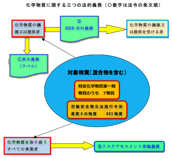 また、表示や通知対象と定められている化学物質を取り扱うすべての事業者に、労働安全衛生法第57条の3による危険性又は有害性に関する調査が義務付けられ、また、調査の結果による必要な対策(措置)の実施も努力義務とされています。