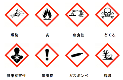 GHS附属書又はJIS附属書により割り当てられた絵表示を記載します。ただし、GHS分類で危険有害性が決定されない場合は、記載する必要はありません。