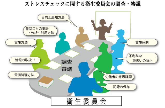 (注)衛生委員会とは、労働者の健康障害の防止及び健康の保持増進に関し事業者に意見を述べるため、所定の事項を調査・審議する委員会のことです。労働者が50人以上いる事業場には設置が義務付けられています。従ってストレスチェックの実施が義務となる事業場には、必然的に設置されていることになります。