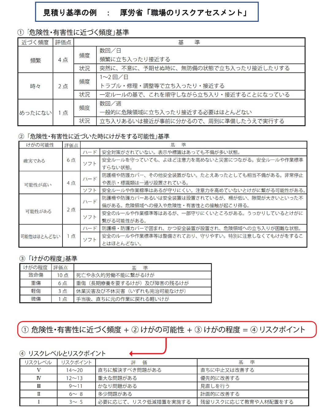 「リスクの見積り」は「優先度の決定」のために必要ですので、「負傷又は疾病の重篤度」及び「負傷又は疾病の可能性の度合」の判定が出来たら、予め決めた基準により優先度を決定します