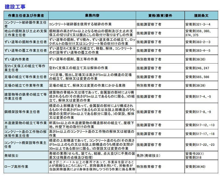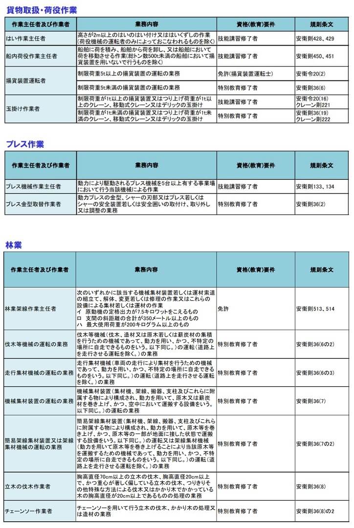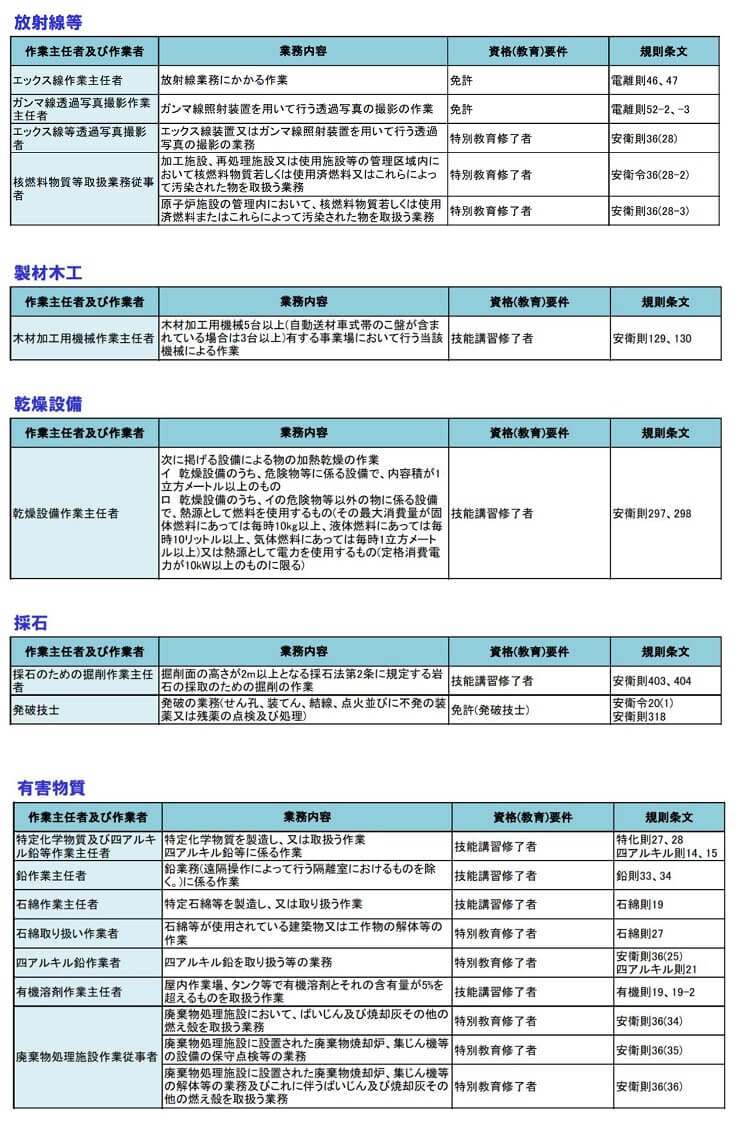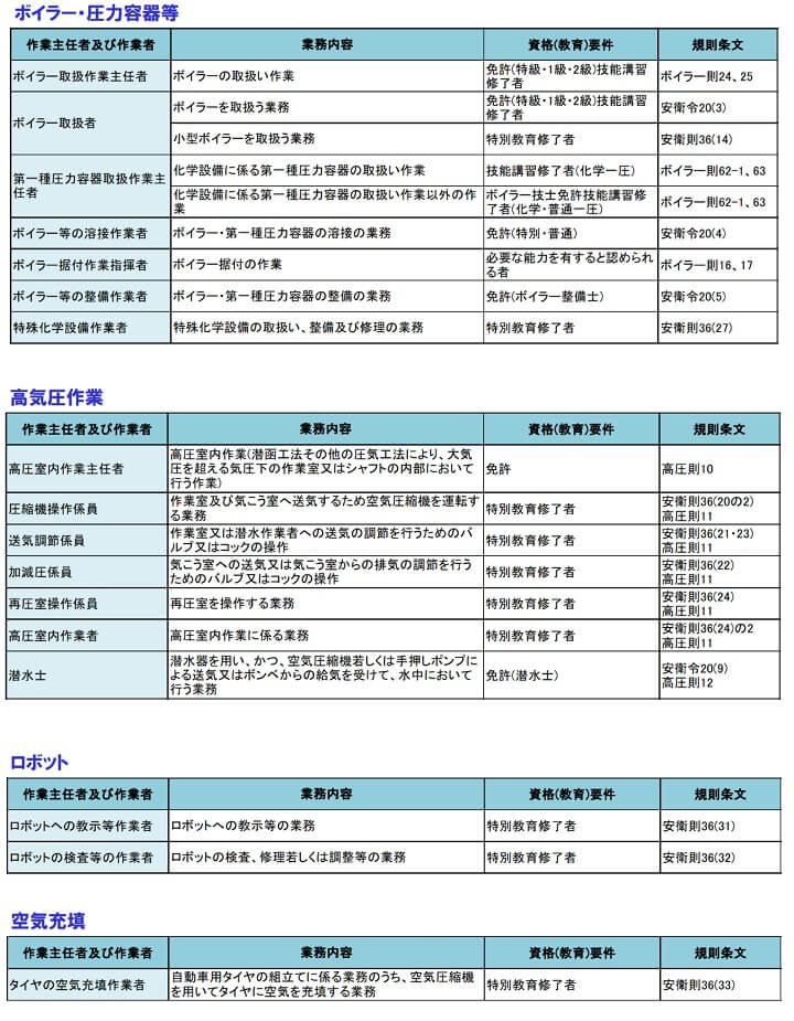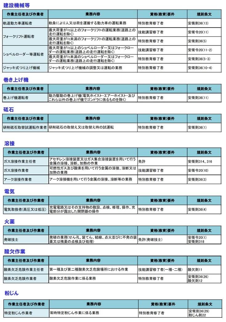 注)3特別教育及び5免許、技能講習の種類については下記の「資格一覧」参照