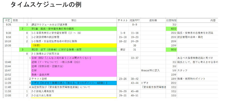そこで、予め指導案やタイムスケジュールを作成し、教える内容ごとに要点をまとめ、講義やグループワークの時間配分、使用教材やテキストのページ番号などを表にまとめておきます。