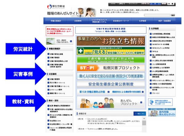 また、インターネット上で自由に活用できるものも公開されています。例として厚労省の「職場のあんぜん」サイトがあります。「教材・資料」の中で動画教材も公表されています。災害事例や労働災害統計もありますので、社内教育に是非活用したいサイトです。