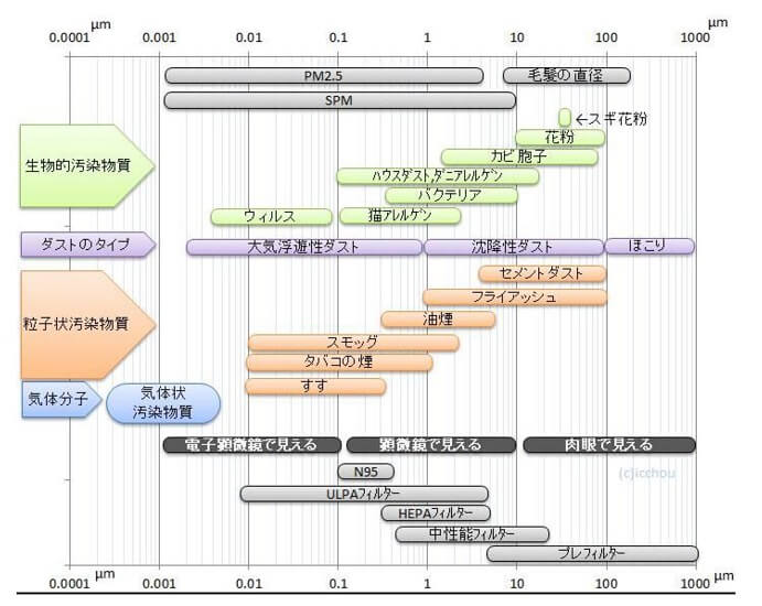 大気環境中の粉じんには粒径、成分のさまざまなものがあり、降下ばいじんは10μm程度かあるいはそれ以上で比較的粒子が大きく、人の肺機能に影響すると考えられています。10μm以下の浮遊粉じんは『浮遊粒子状物質(SPM)』と呼ばれれ、さらに近年では2.5μm以下のものをPM2.5として規制されるようになっています。