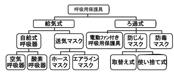 呼吸用保護具は、給気式とろ過式に大別されます。