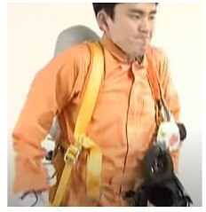 ①空気呼吸器を左手から(圧力指示計、警報器のついている方から)背負います。