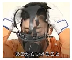 呼吸を止めて面体のバックルを起こし、しめひもをゆるめ、面体を外します。その後、そく止弁を閉じます。