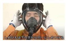 そく止弁を開いた後、面体を顔に密着させ吸気します。このとき、自動的にプレッシャデマンド弁が作動し空気が供給されます。面体の頬の部分に指を入れ、空気が面体の外に向かって漏れることを確認します。面体の取外しは、陽圧ロックボタンを押し顔から放します。