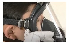 ⑨深く呼吸をすると「パチッ」と音がして空気が供給され、面体内が自動的に陽圧になります。面体の頬の部分に指を入れ、空気が漏れることで陽圧なっていることを確認します。