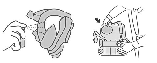 ①面体のアイピースの内側にくもり止め液をスプレーし、柔らかい布等で軽くのばし、少し乾いてから(10~20秒後)、息を吹きかけてもくもらないことを確認します。