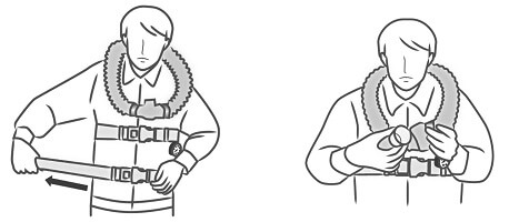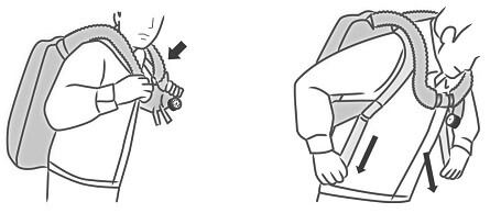⑦二又管と面体を接続し、面体のつりひもを首にかけます。
