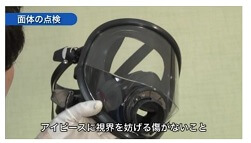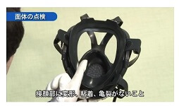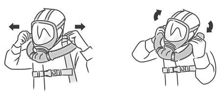 ⑫呼気管と吸気管を左右の手で強く握って閉塞し、軽く吸気し面体が顔に吸い付くことを確認します。そのまま首を上下左右に振った後も吸い付いたままであることを確認します。