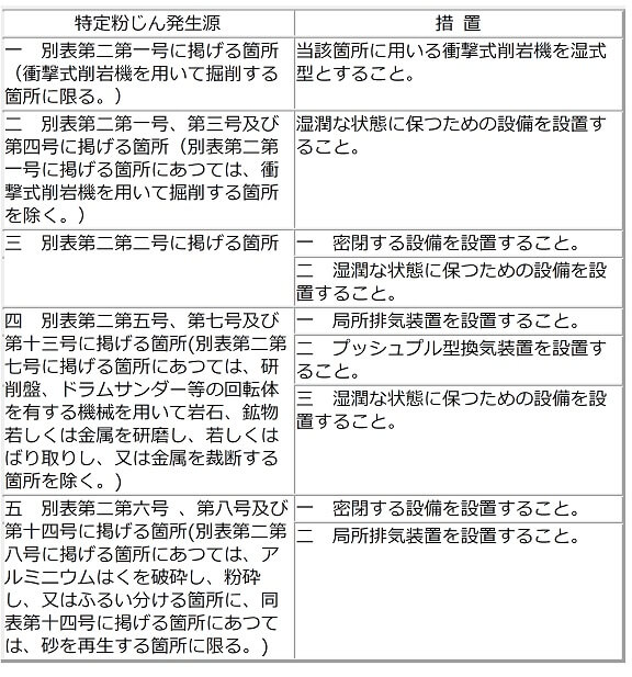 事業者は、特定粉じん発生源における粉じんの発散を防止するため、次の表の上欄に掲げる特定粉じん発生源について、それぞれ同表の下欄に掲げるいずれかの措置又はこれと同等以上の措置を講じなければならない。